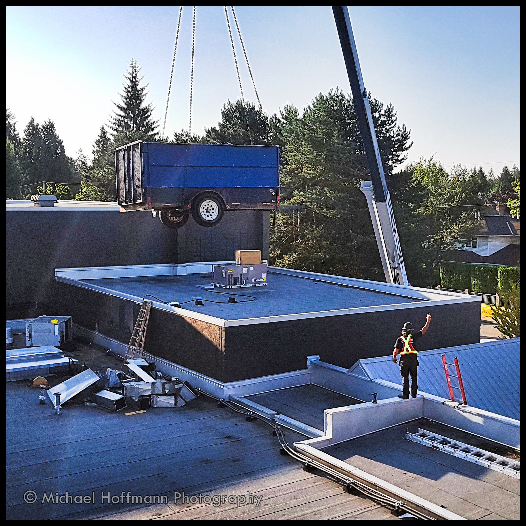 Thanks Una! I took this at our high school – during the installation of new A/C Units, especially for the Music room. The trailer was lifted on-site by a crane to haul away the old equipment and debris. I like composition full of interesting angles and lighting and an unusual subject.