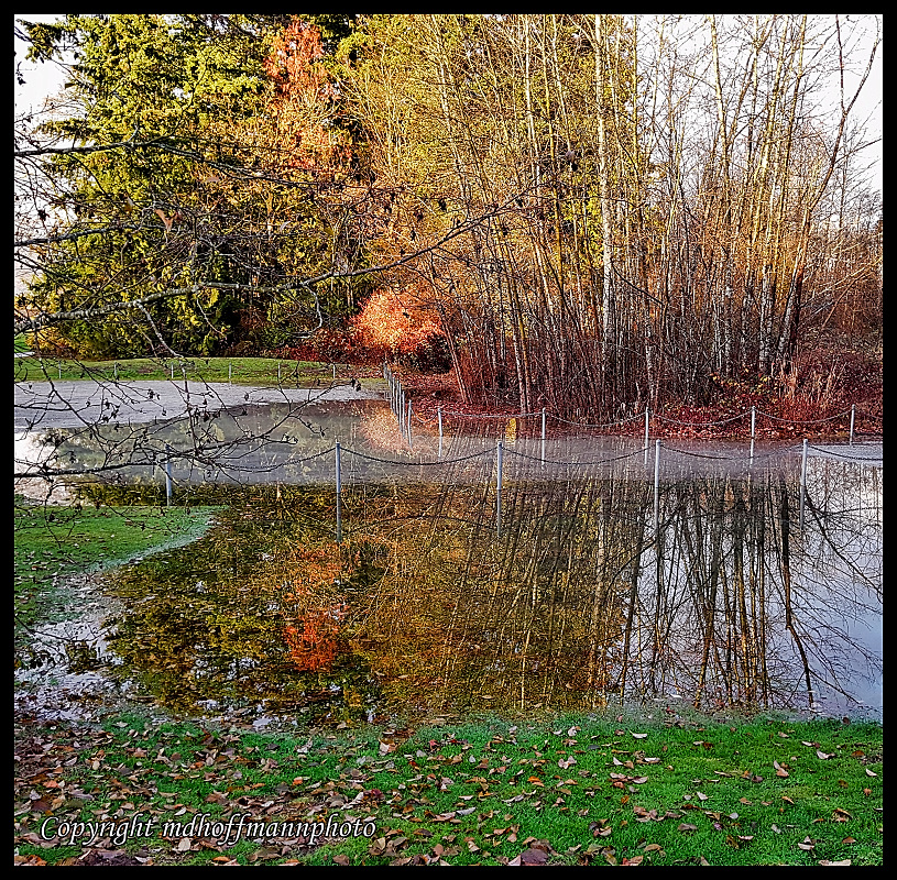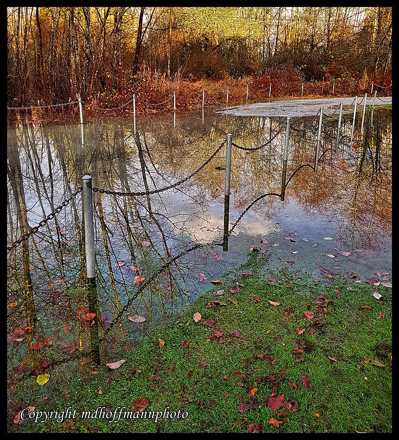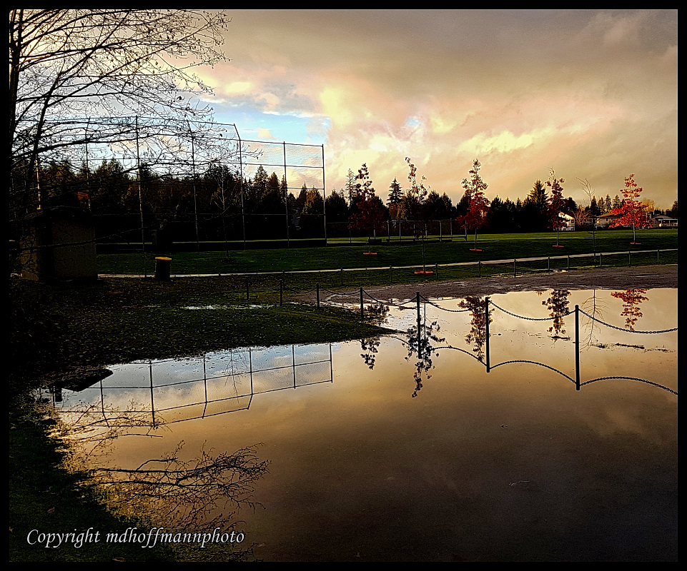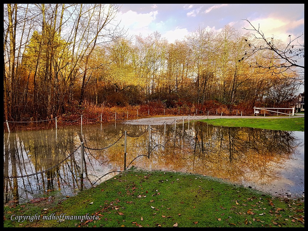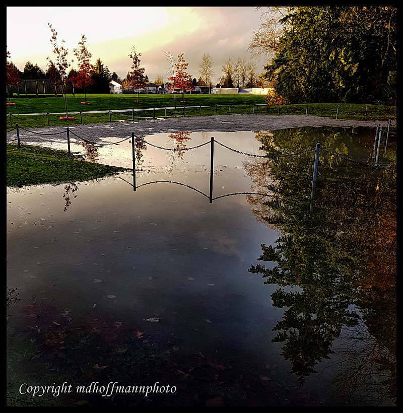 I drive past this playground parking lot almost daily, but have never seen it flooded. So when I drove by late one afternoon after a very heavy rain, I was intrigued by the chainlink reflections and the sweet lighting. I took these shots within a few minutes – interesting how different angles and viewpoints create different images.